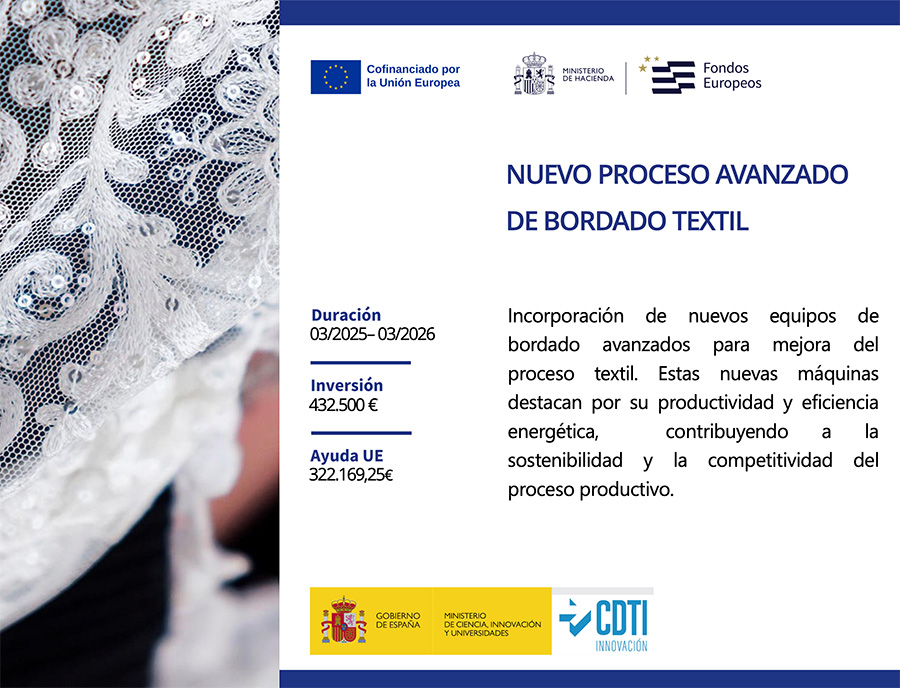 ARTMAY JOFRA SL ha recibido una ayuda por importe de 140.900,00 euros con número de expediente INPYME/2025/1 para el desarrollo del proyecto titulado “nuevas líneas de bordado”, para la adquisición de equipos productivos en el marco de la convocatoria, para el ejercicio 2025, de las ayudas para apoyar a las inversiones para la reindustrialización realizadas por las pymes de varios sectores industriales de la Comunitat Valenciana. INPYME 2025.