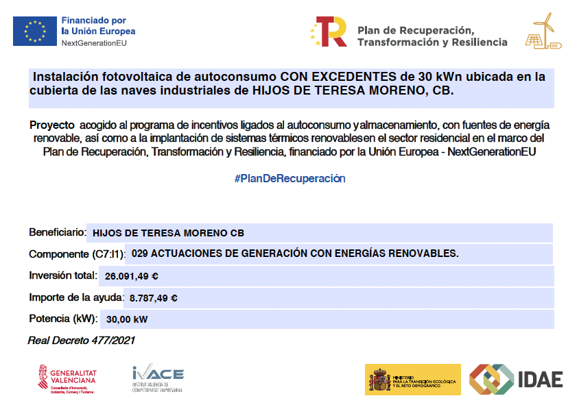 ARTMAY JOFRA S.L. (Hijos de Teresa Moreno C.B.) ha recibido una ayuda de 5.800 euros, para adquisición de dos unidades de Citroën C4 100% eléctricos, de la Unión Europea con cargo al Fondo Next Generation EU, en el marco del Plan de Recuperación, Trasformación y Resiliencia, para la adquisición de vehículos eléctricos “enchufables” y de pila combustible dentro del Programa de incentivos a la movilidad eficiente y sostenible (Programa MOVES III Vehículos Comunitat Valenciana) del Ministerio para la Transición Ecológica y el Reto Demográfico a través del IDAE, gestionado por el Instituto Valenciano de Competitividad Empresarial (IVACE)